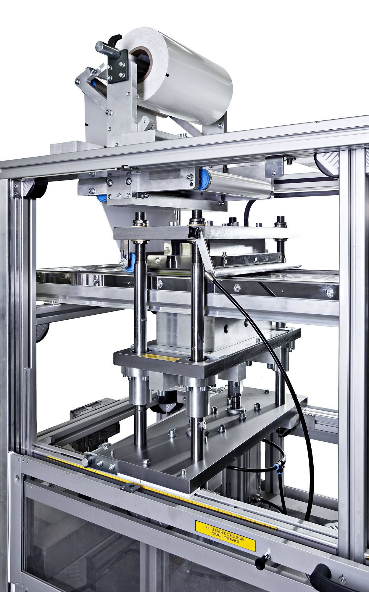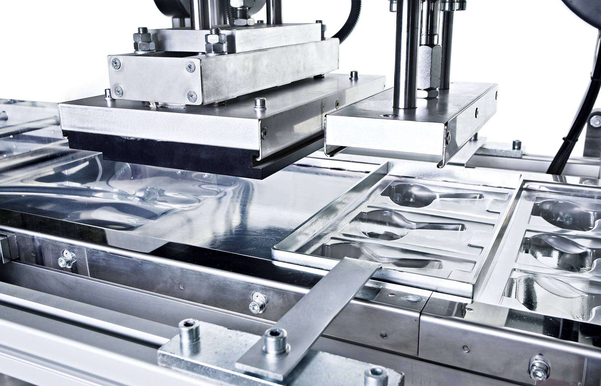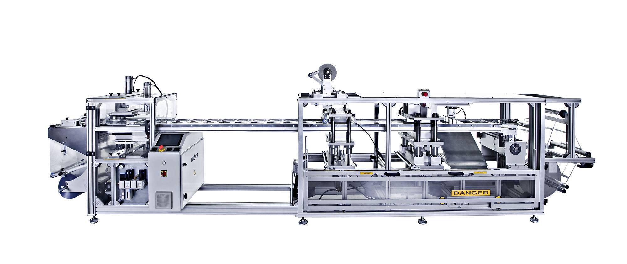 Plastic film is fed from a roll into a set of indexing chains that pierce the film and move it through a contact heater for heating to forming temperature. The heated sheet then indexes into a forming station where parts are formed by vacuum. The loading area allows the manual feeding of the products and the paper insert (if needed). Once products are already placed inside the formed blisters, the sheet moves into a sealing station where the complete working area is sealed against a plain film or a cardboard. Finally, the sheet moves into a die-press, mounted immediately after the sealing press, where individual blisters are punched out.