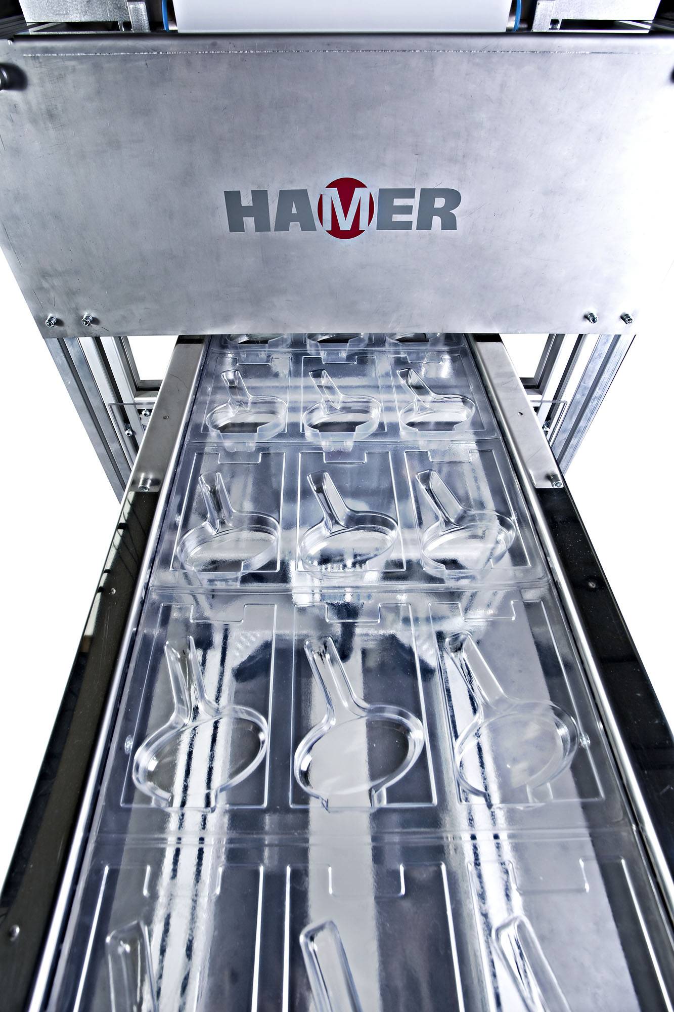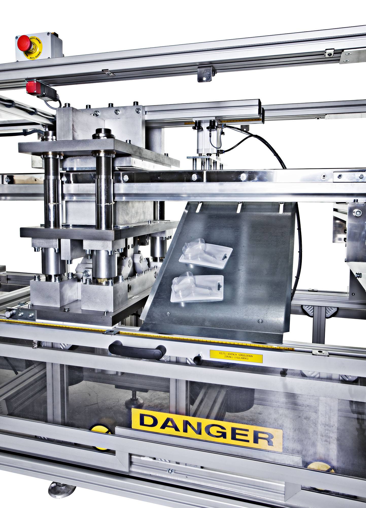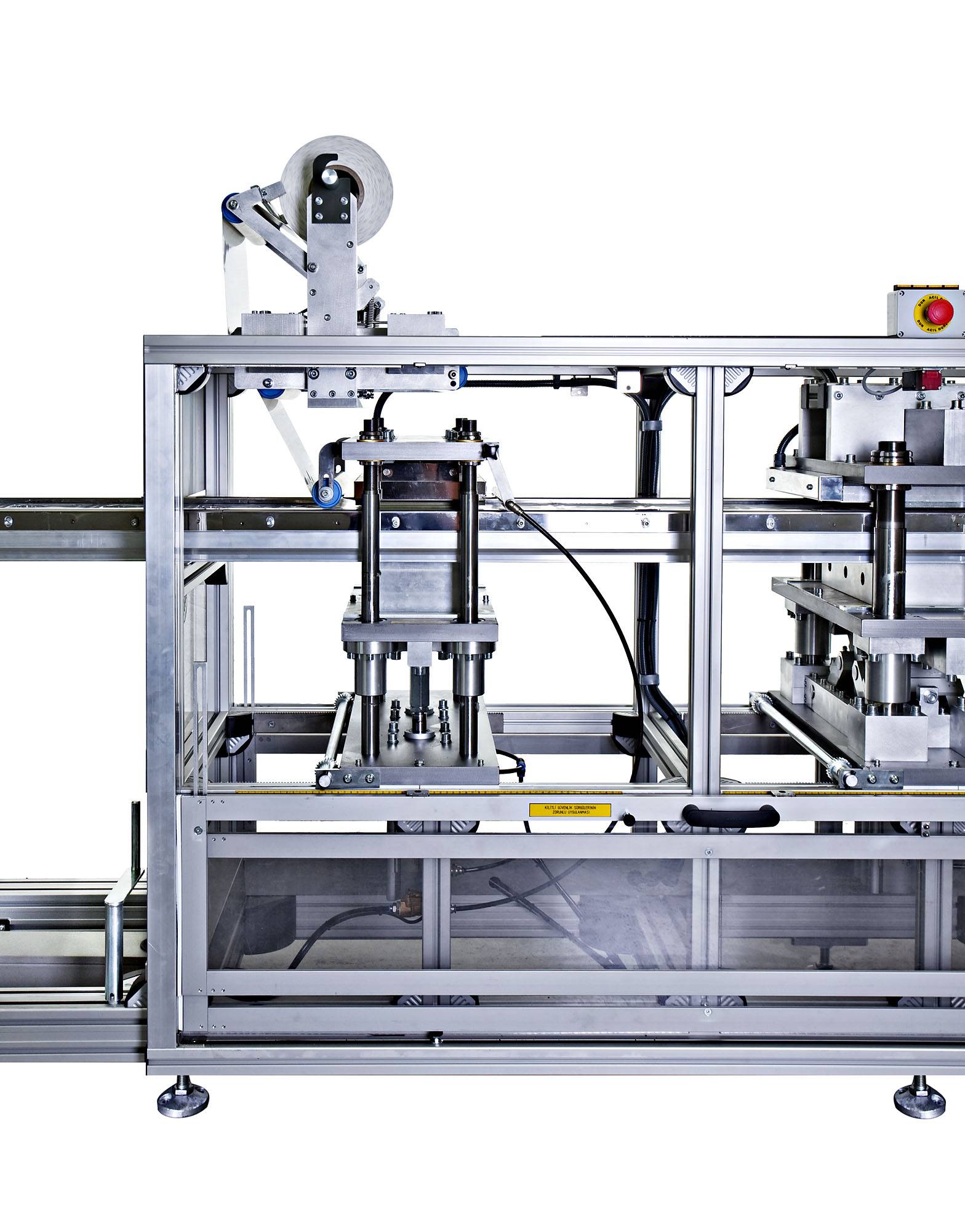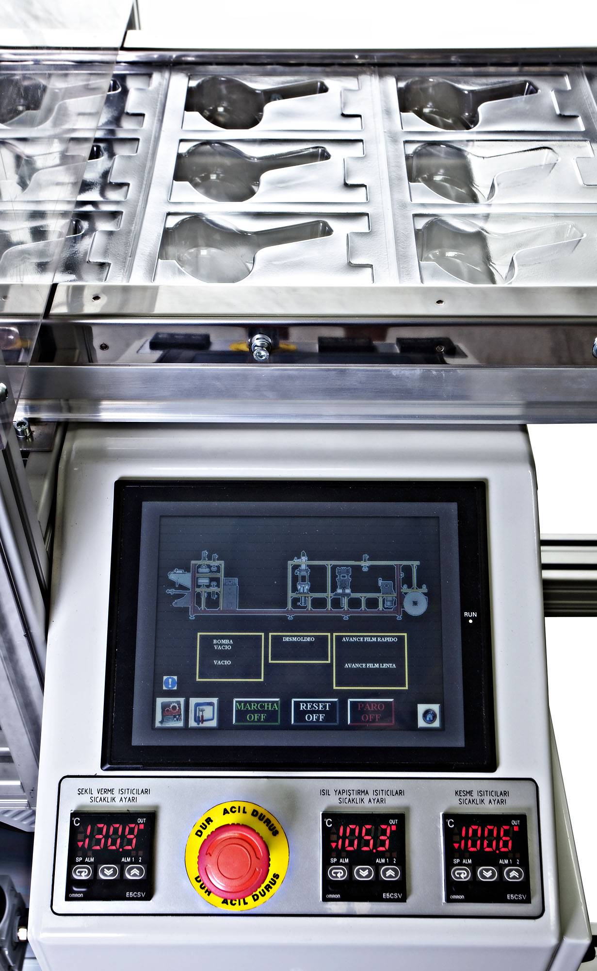 Plastic film is fed from a roll into a set of indexing chains that pierce the film and move it through a contact heater for heating to forming temperature. The heated sheet then indexes into a forming station where parts are formed by vacuum. The loading area allows the manual feeding of the products and the paper insert (if needed). Once products are already placed inside the formed blisters, the sheet moves into a sealing station where the complete working area is sealed against a plain film or a cardboard. Finally, the sheet moves into a die-press, mounted immediately after the sealing press, where individual blisters are punched out.