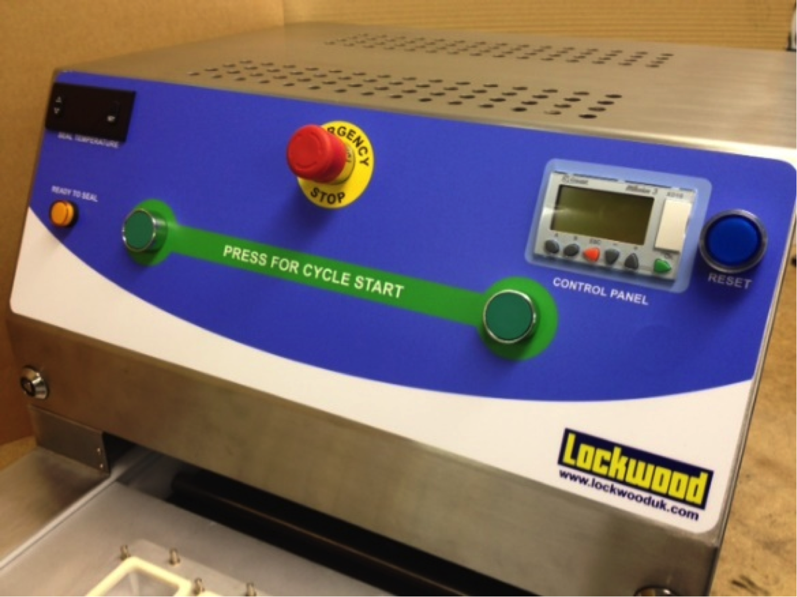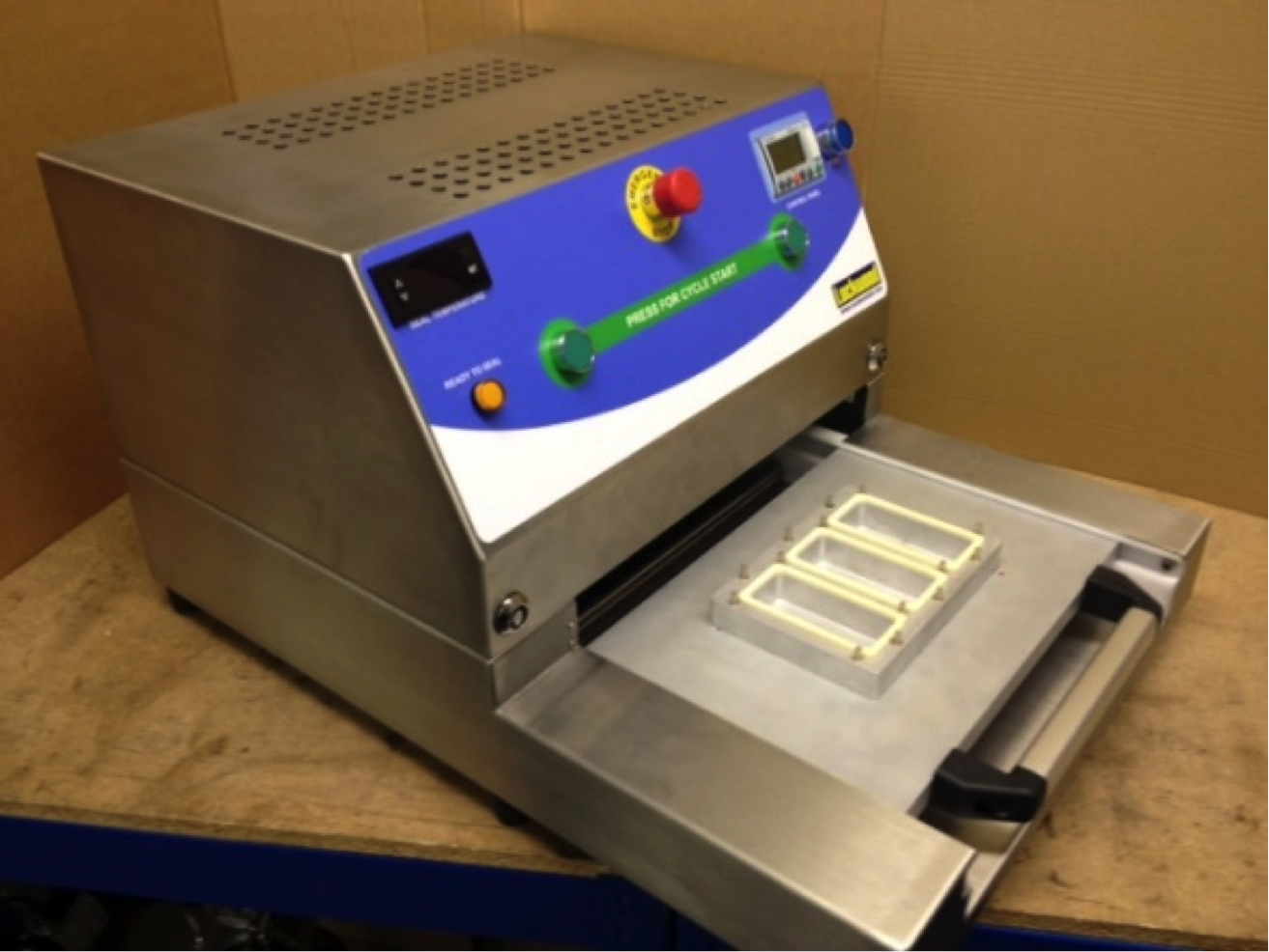 The LMP is easy to operate with two green start buttons on the front of the machine (two handed start for safety) and once pressed the head will automatically come down and seal the lid to the tray. If one finger is removed from a start button before the head has fully engaged the head will instantly raise preventing any possibility of injury.
