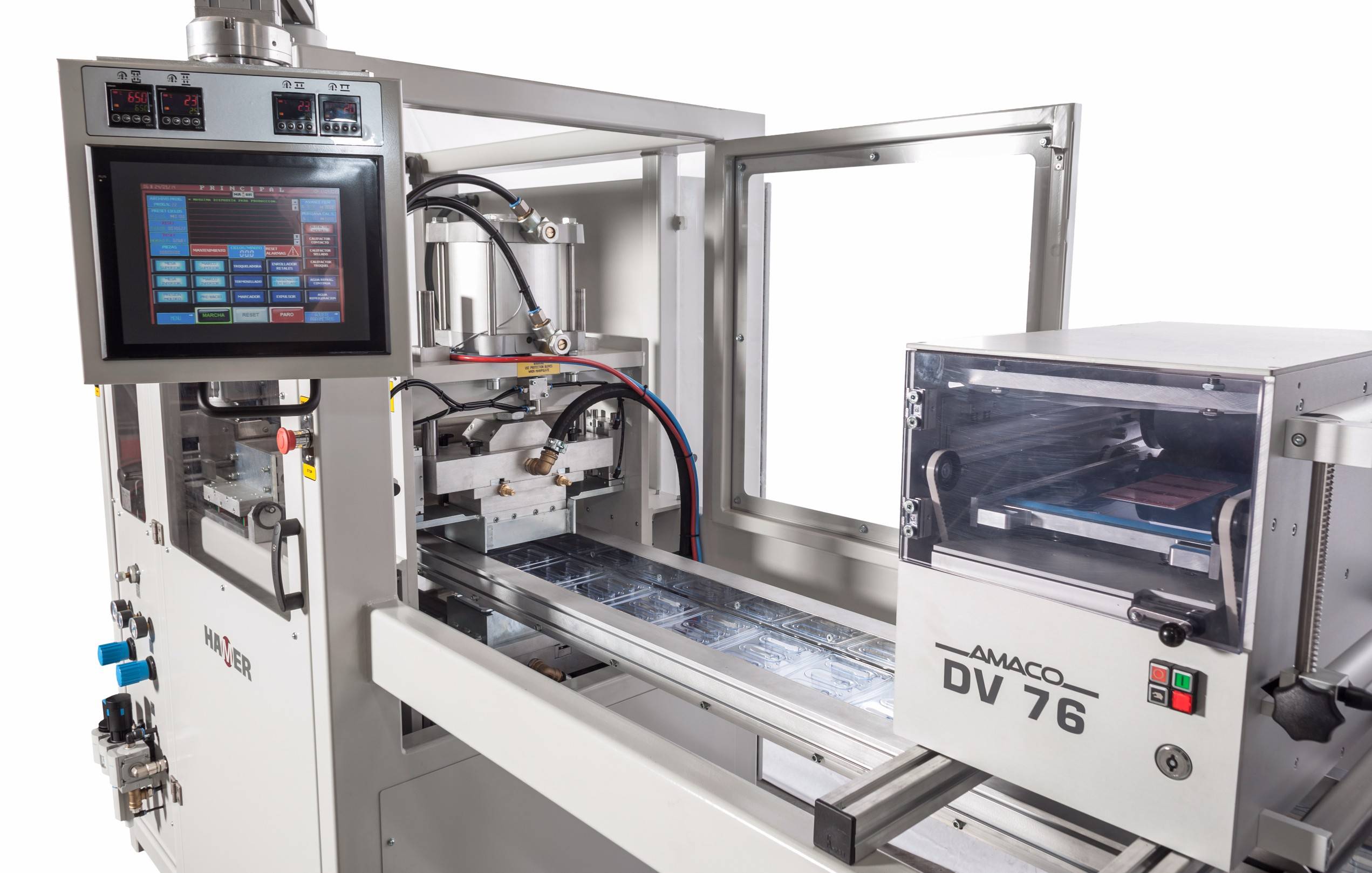 Thermoforming action is done by vacuum assisted with air pressure (up to 2 bars). Forming is always below the material line, being maximum forming depth 60 mm. Forming platens have a closing force og 18.5 kN. Lower platen is motioned by a vertical pneumatic cylinder in combination by a mechanical toggle system. Upper platen is motioned by a direct cylinder. Both platens run independently. Clamping frames are motioned by their own pneumatic cylinders.